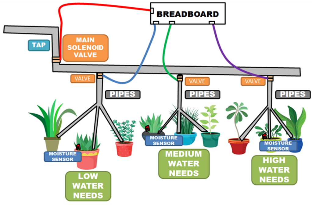 In our prototype, the pumps are submerged in water in a big vessel. We have another design where the whole project is connected to a water output using a solenoid valve that is also controlled by the app. This cuts down the effort of filling up the water reservoir.