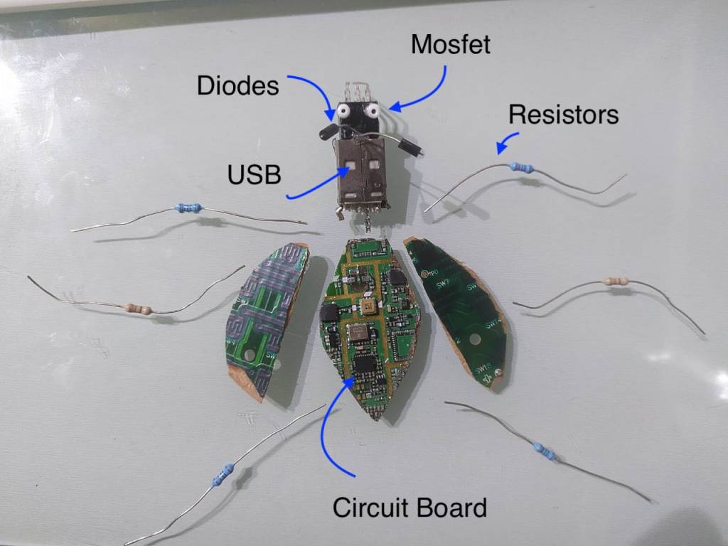 Step 4: Arrange different electronics components out to make an insect-like structure. I used resistors as the legs, a pair of diodes for the antennae, a mosfet for the face, a USB for the body and a pair of white beads for the eyes.
