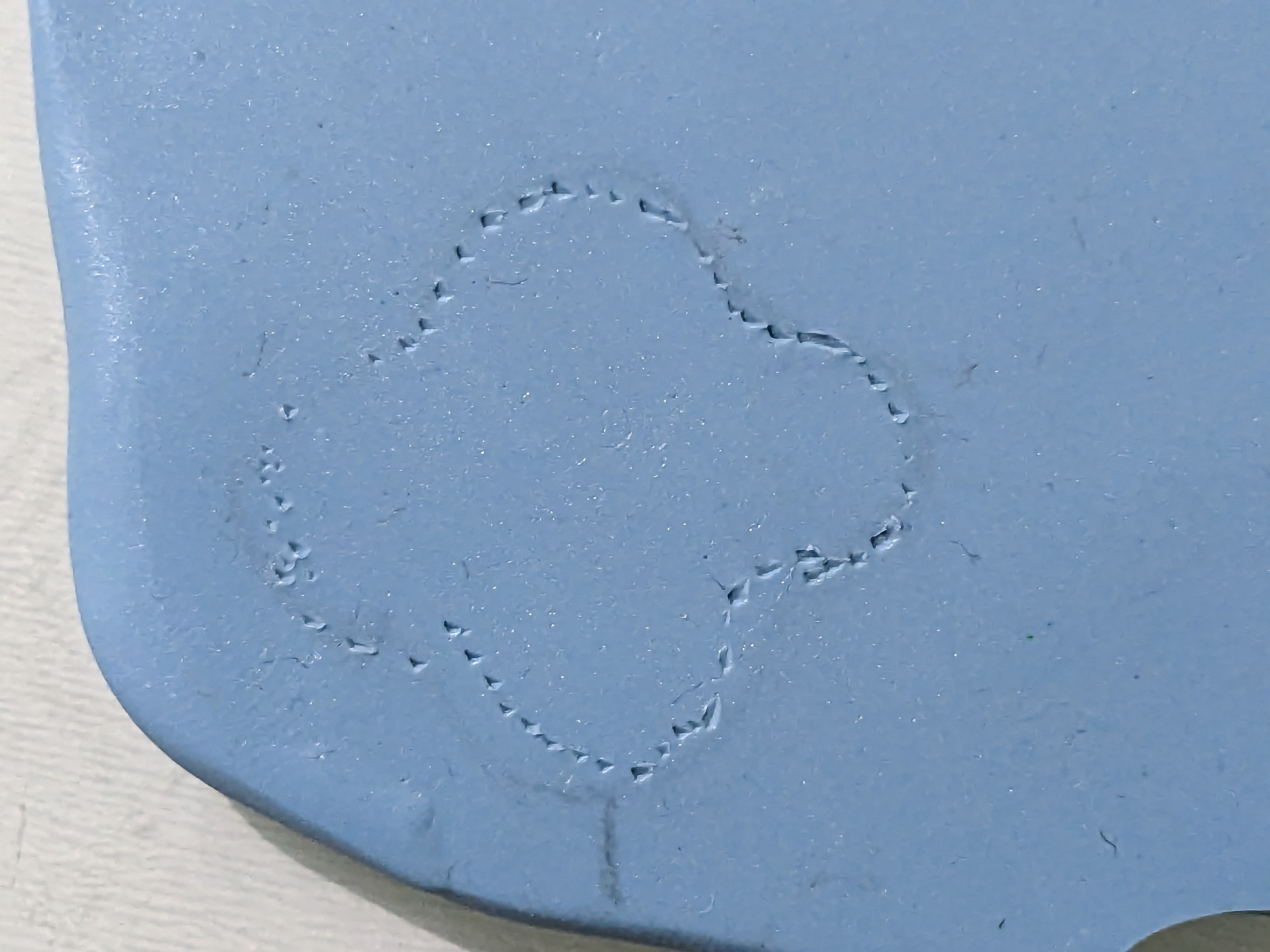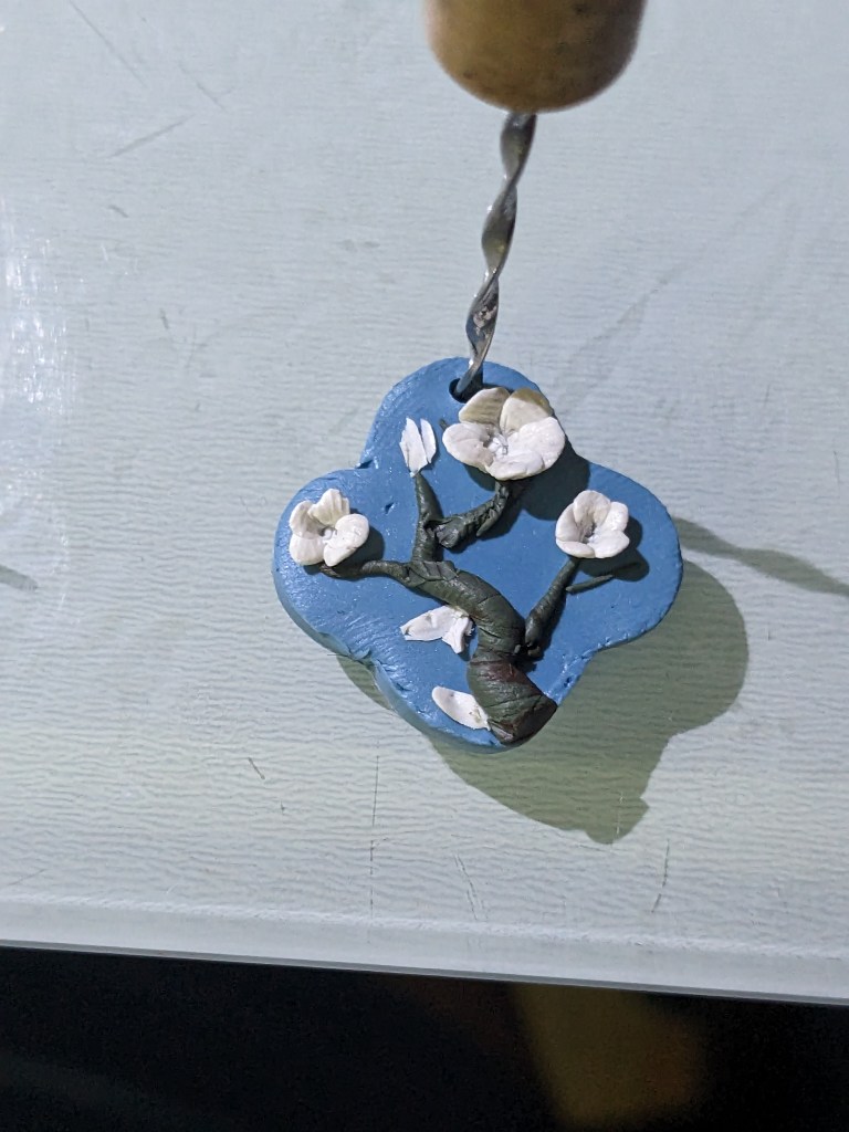 Step 11: Use the hand drill to create two holes: one at the top and one at the bottom. You can also do this post-baking if you have a power tool.