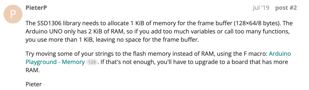 Integration of the OLED was by far the most exhausting step. All the example programs would work, but my program just wouldn’t. In fact, if I changed any sample program to run using custom functions for the same thing, the SSD allocation would fail. I eventually gave up and ordered another OLED from Amazon. Even the sample programs wouldn’t work any longer. It took me three days to realise that the seller sent the wrong model because the board had no standardised markings. I eventually made my way back to my original OLED. After days of struggling with the OLED, I came across this tiny paragraph on the Arduino forum.