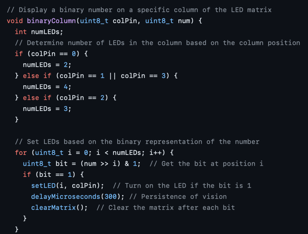 Each bit is displayed for 300 ms, and the persistence of vision makes it look like all the LEDs are on at once. Here is why that’s needed: