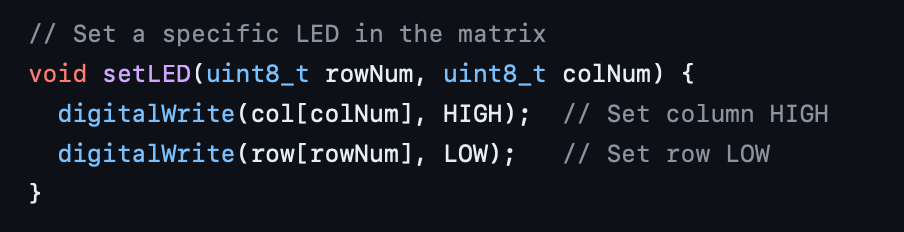 The function setLED() just translates to switching an LED at row x and column y by keeping the column at high and row at low as this creates a path for current to flow through that LED specifically. I had worked with LED matrices before but under the abstraction of Arduino libraries. This source helped me understand this: Explanation by Mika Tuupola