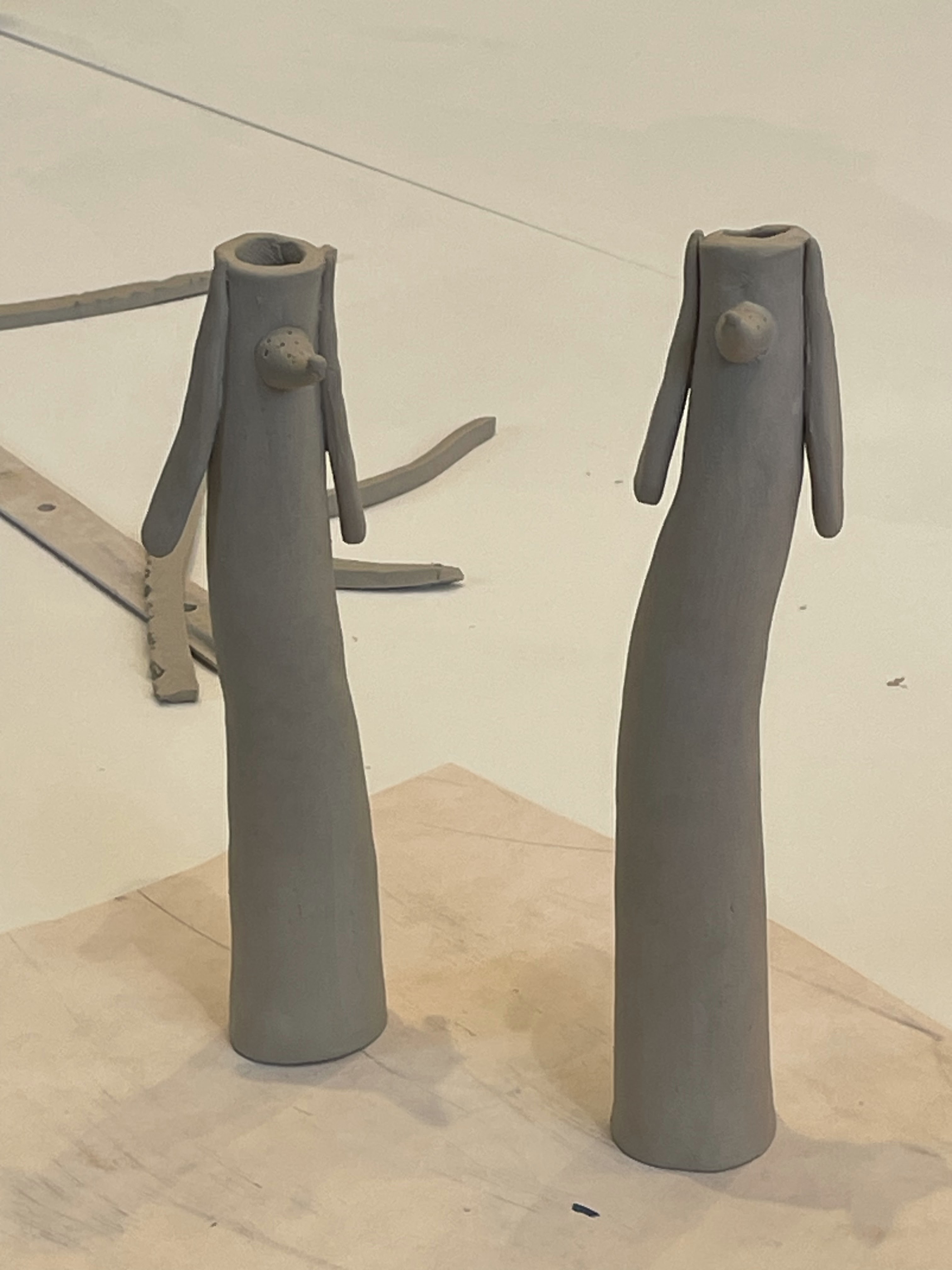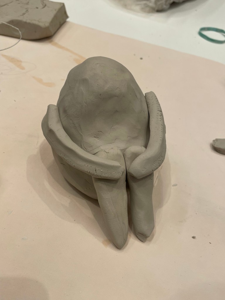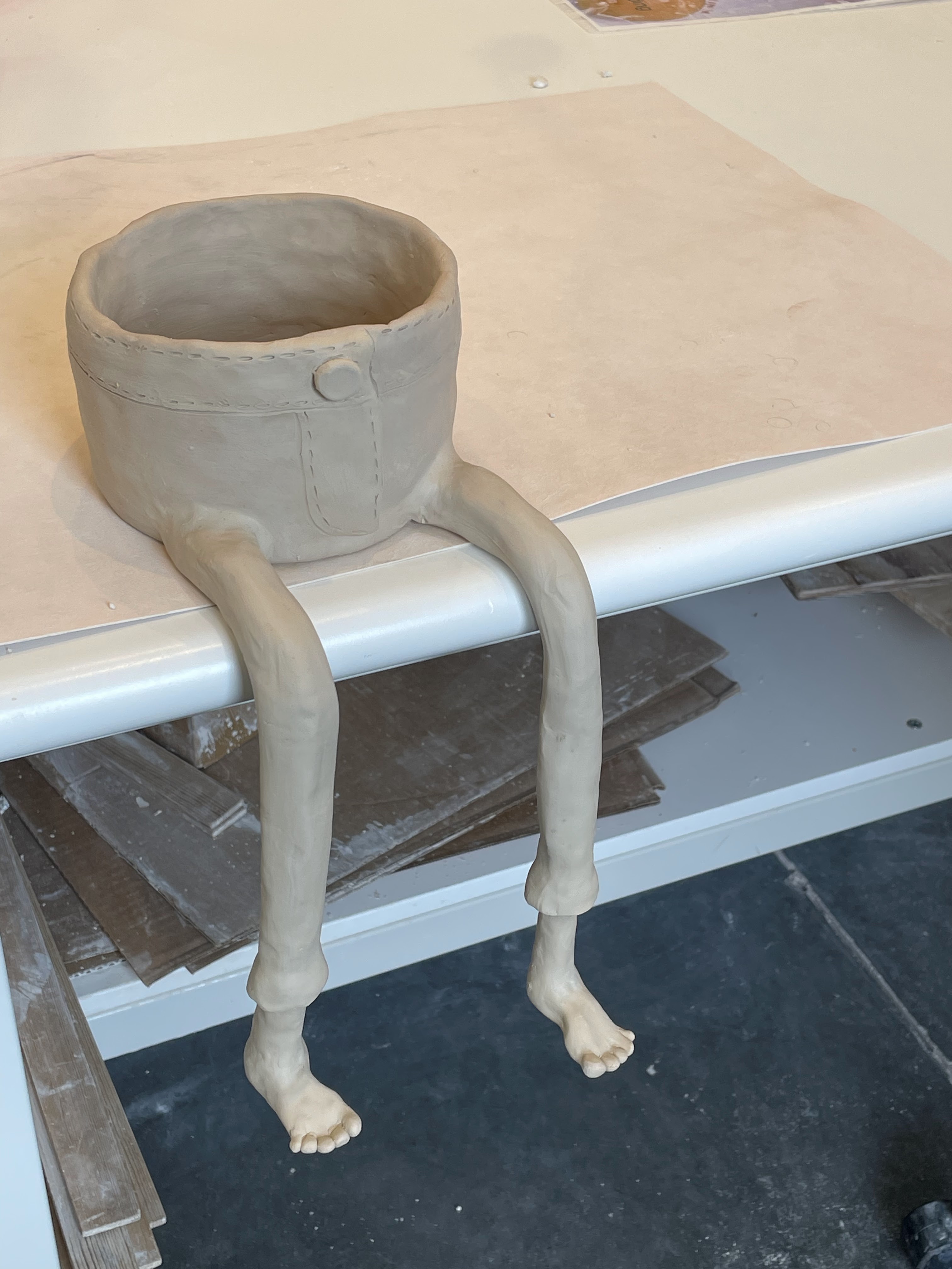 This one’s a planter — and the legs were definitely the trickiest part. It was a challenge getting them to dry without collapsing under the weight of the unsupported clay, and I had to be really careful during the building and drying process to keep them intact. I’m planning to glaze the pants with this matte, denim-esque glaze we have in the studio, and eventually plant a little succulent in it. Storing it for the summer was such a hassle — I packed it in a box cushioned with sweaters, so fingers crossed they worked their magic and the piece didn’t break!