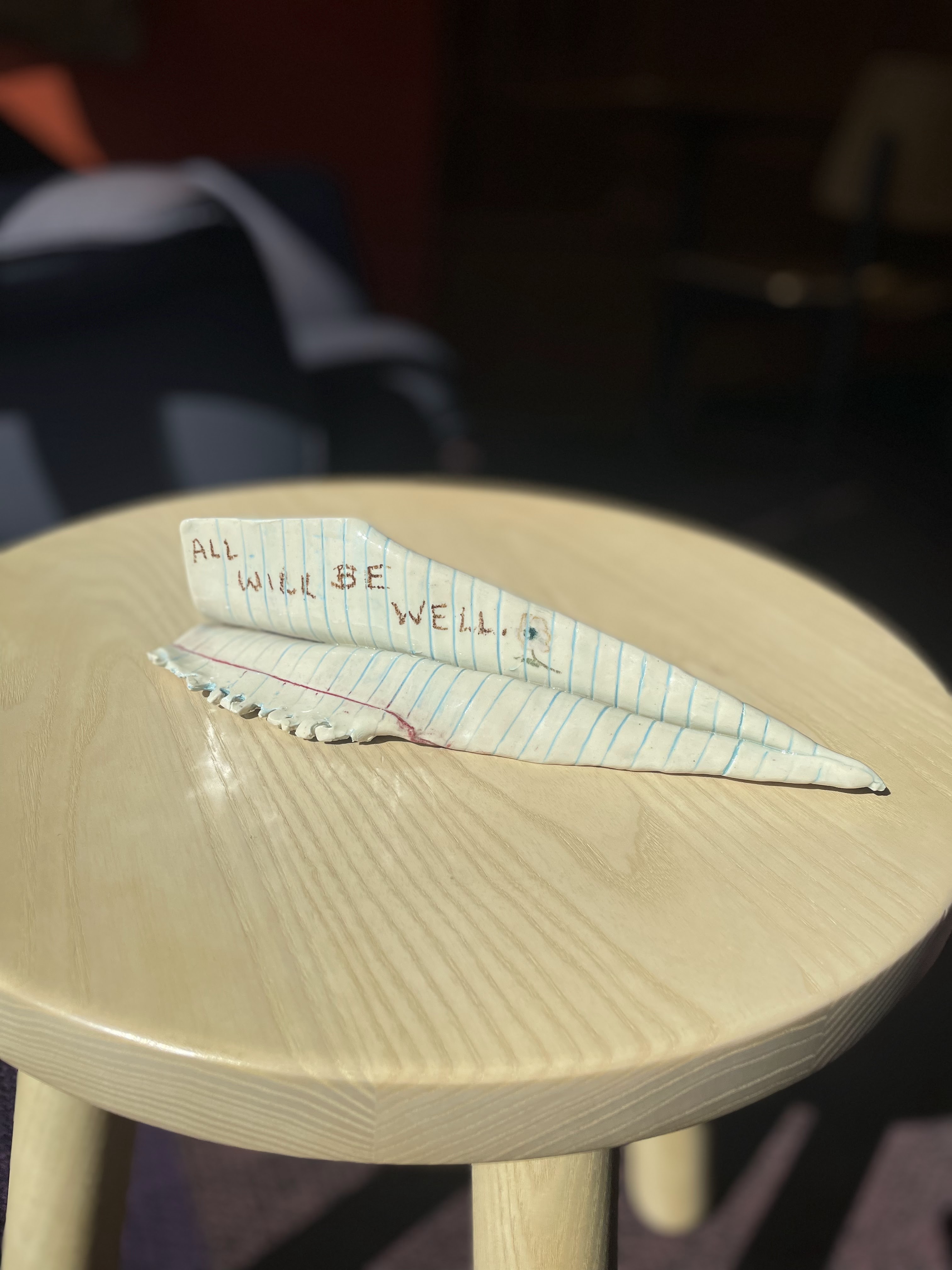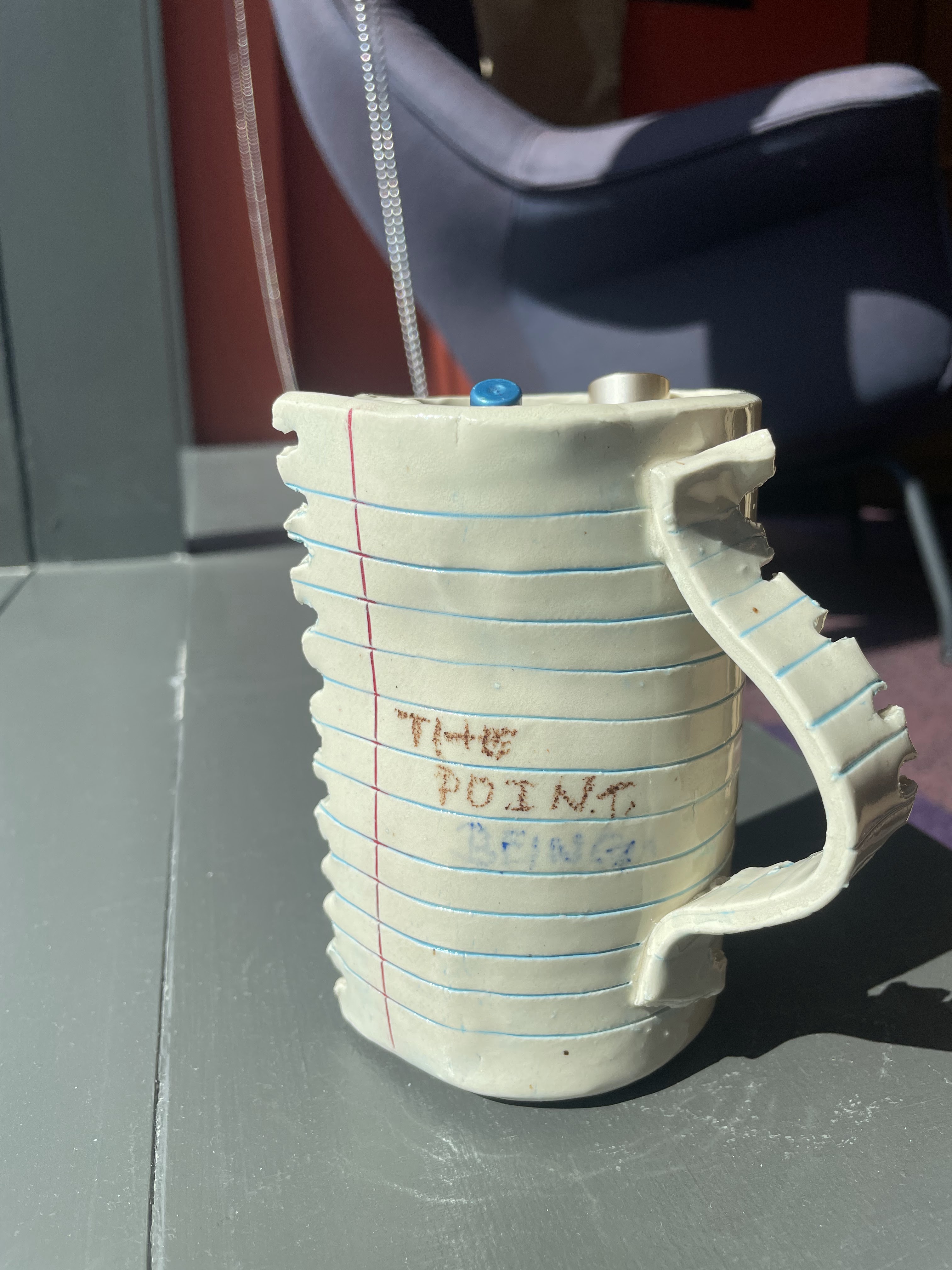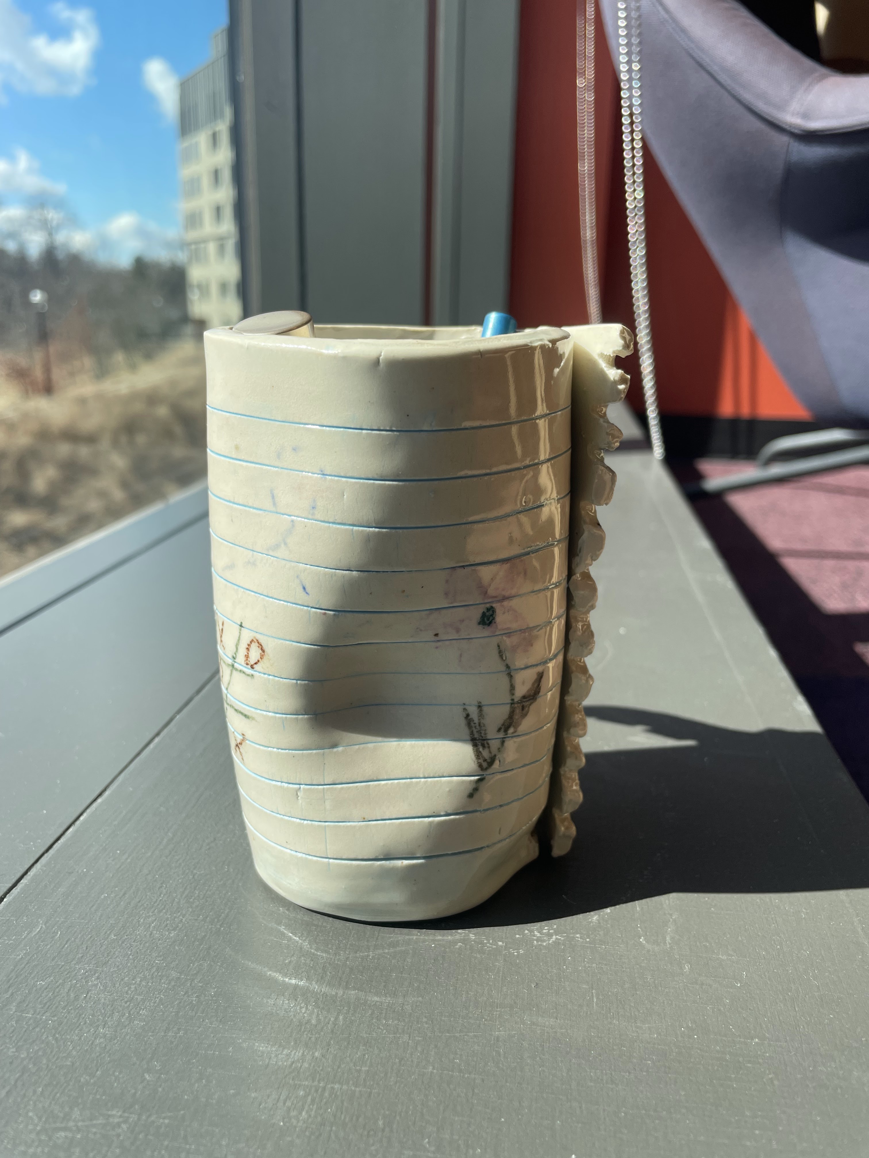 This one’s a planter — and the legs were definitely the trickiest part. It was a challenge getting them to dry without collapsing under the weight of the unsupported clay, and I had to be really careful during the building and drying process to keep them intact. I’m planning to glaze the pants with this matte, denim-esque glaze we have in the studio, and eventually plant a little succulent in it. Storing it for the summer was such a hassle — I packed it in a box cushioned with sweaters, so fingers crossed they worked their magic and the piece didn’t break!