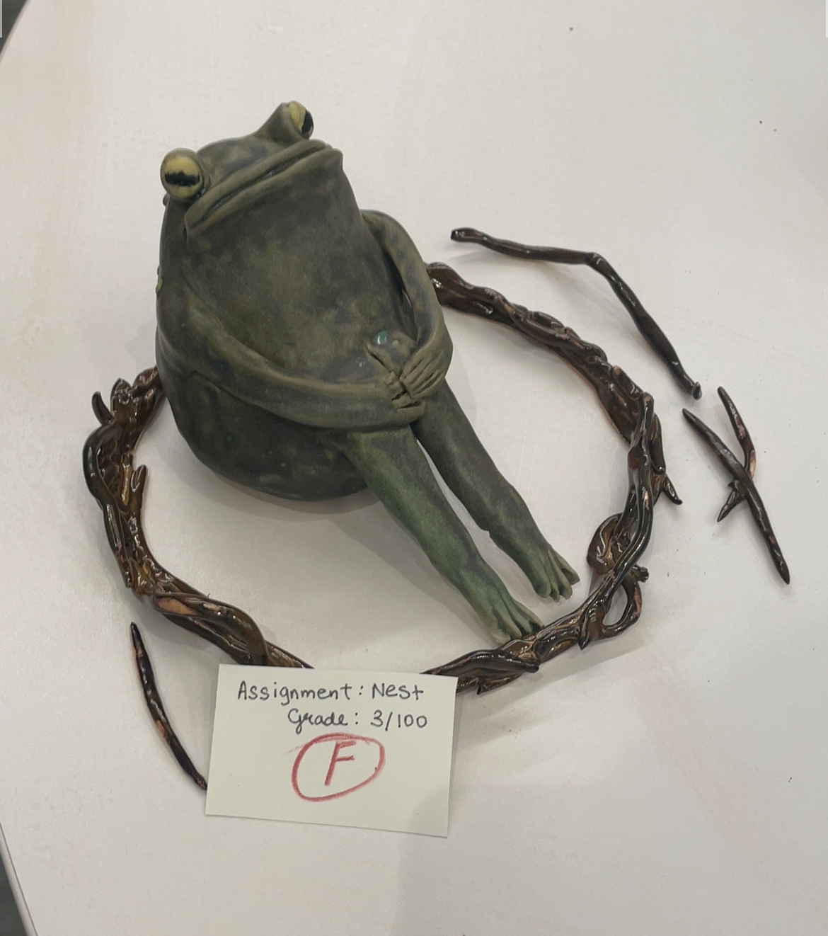 I wanted to make a piece that reflected the narrow and sometimes arbitrary criteria used in testing and evaluation. So I made a toad – sitting in a really poorly built nest that had been graded an F. The point was that a toad isn’t supposed to build a nest. Testing it on its ability to do so, and then calling it a failure for not meeting that standard, just doesn’t make sense.