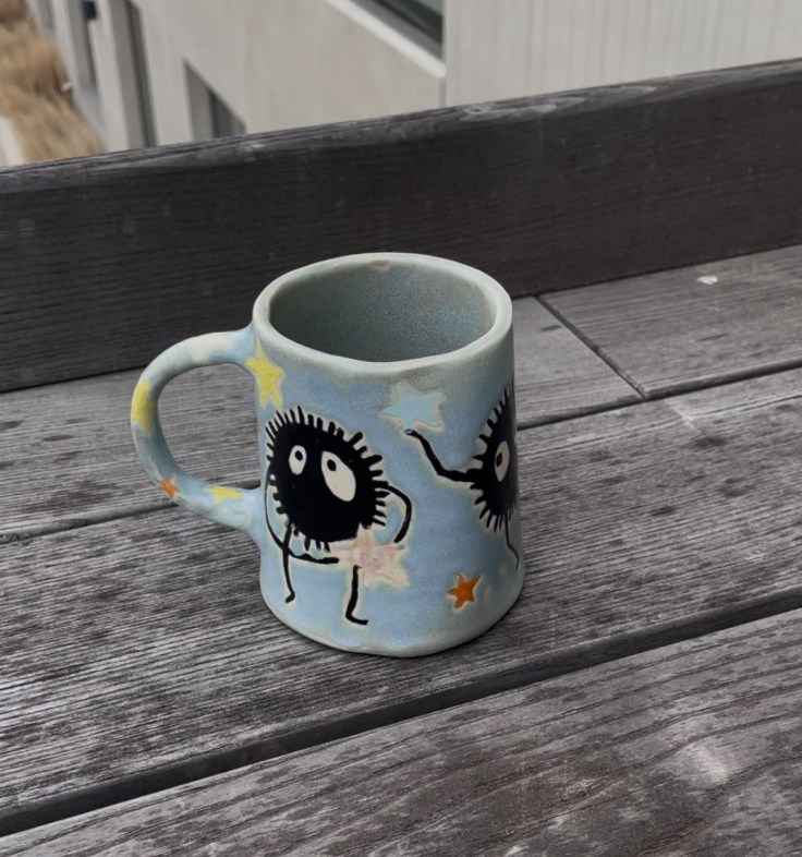 This is a handbuilt mug with soot sprites on it. I watched Spirited Away sometime over the summer, and found the little sprites incredibly cute. So, when I had to choose a motif for my first handbuilt mug, I went with them! I first drew out the sprites and the stars using a normal graphite pencil. Then I used three layers of underglaze to paint in those details. I then painted two layers of clear over the underglazed parts. Then, I went over all those parts with wax resist. Once that dried, I dip glazed the entire mug with three coats of shio blue.