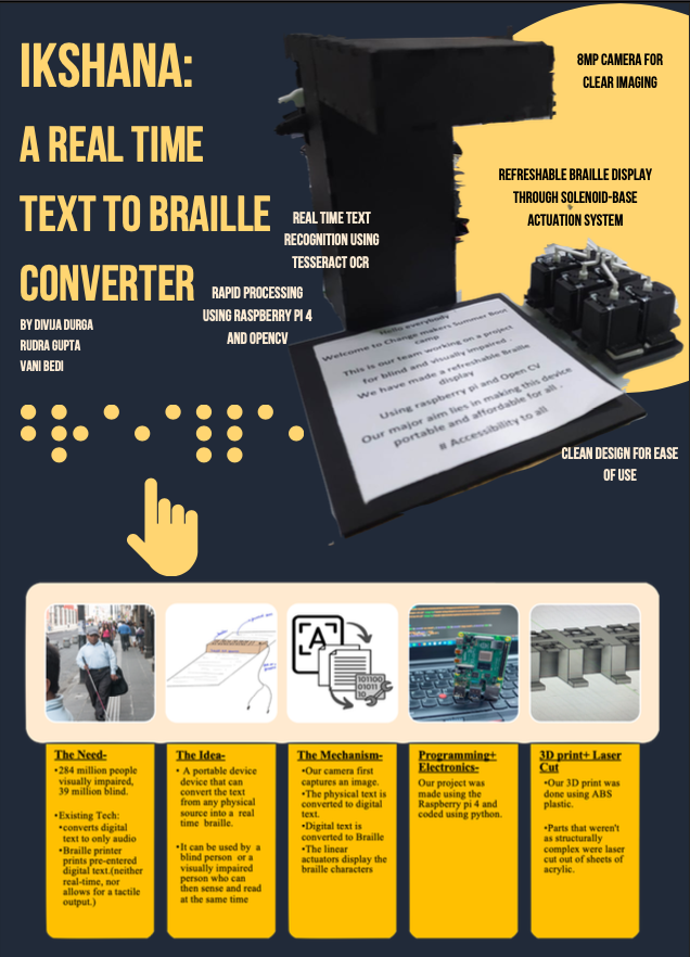 Our team created IKSHANA, a real-time text-to-braille convertor as part of a 5 week bootcamp hosted by the Indian Institute of Technology, Delhi. It can scan text from physical sources like newspapers, postcards, or phones and instantly generate braille.