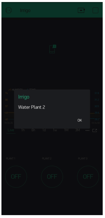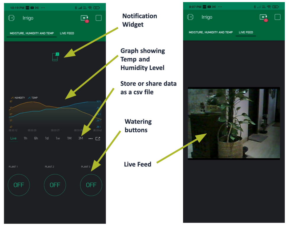 The app graphically presents the humidity and temperature of the plants. It has watering buttons that allow a user to water their plants. The most recent prototype also offers a live feed.