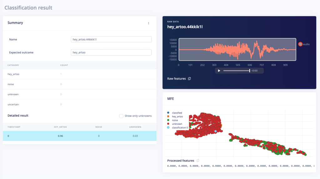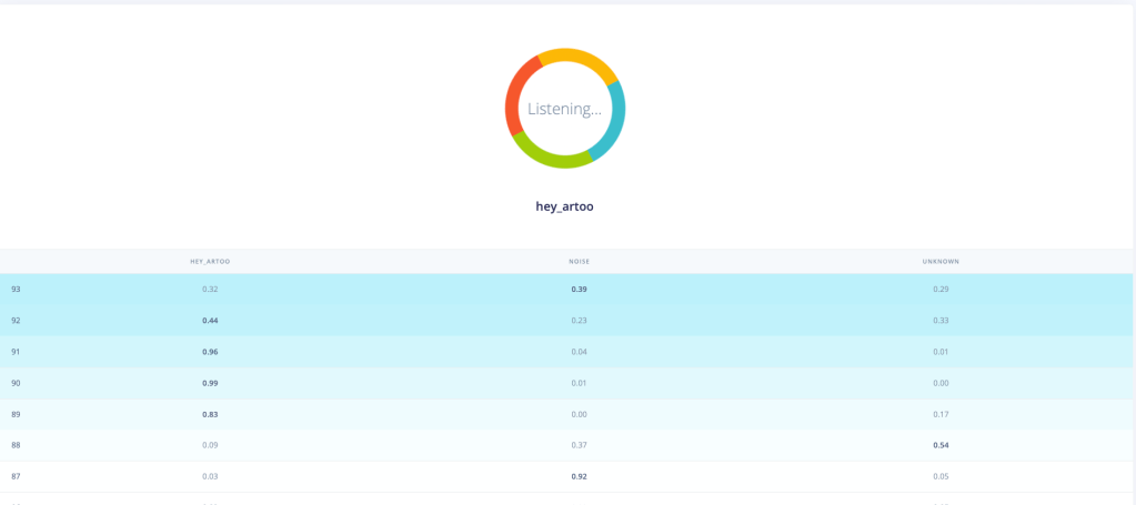 I used Edge Impulse, a development platform for edge machine learning models. It’s pretty great for a newbie like me. The entire way this works is so cool to me. The code essentially converts any sensor data or audio stream into a spectrogram and then uses image recognition techniques to recognise and learn features. I’ve successfully created a model that can recognise “Hey Artoo”. It has pretty decent precision. It has been trained on my voice (and some low/high-frequency versions I generated) alone, so I’m sure there is lots of room for improvement.