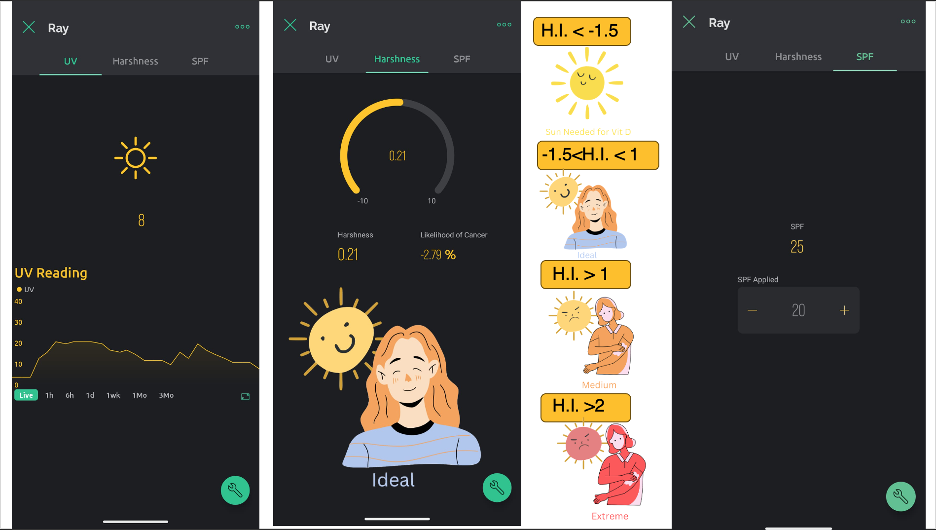 - Harshness Index: UV monitoring technology currently available in the market displays only real-time UV values. However, prolonged UV exposure can be harmful, and existing solutions do not take into account the duration of exposure.Additionally, existing solutions do not account for the application of sunscreen by a user. Our solution utilizes Machine Learning to develop a “Harshness Index”. It incorporates a temporal component, hence, considers both the time of exposure and the level of UV radiation. Additionally, our project takes in user input about the SPF applied. Based on this data, it makes personalized suggestions to users to increase or decrease their sun exposure.